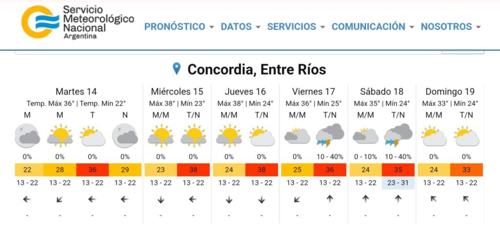 La semana del 13 al 17 de enero será la más calurosa del verano 2024/2025. Las temperaturas alcanzarán su pico máximo el miércoles 15 y jueves 16, con registros que llegarán hasta los 38 grados en Concordia y la región. Para los primeros días de la semana, lunes 13 y martes 14, se esperan mínimas de 20 grados y máximas de 35°, mientras que hacia el miércoles y jueves las mínimas subirán a 24°.
