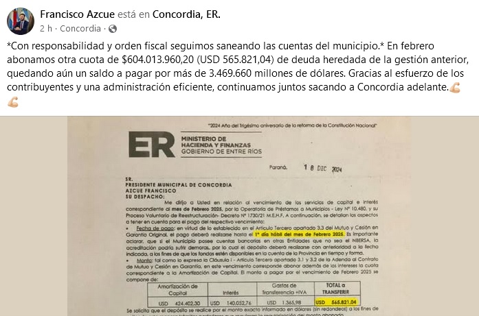 A través de un posteo en las redes sociales, el Intendente de Concordia Francisco Azcué anunció el pago de una nueva cuota de la deuda heredada de la gestión anterior.