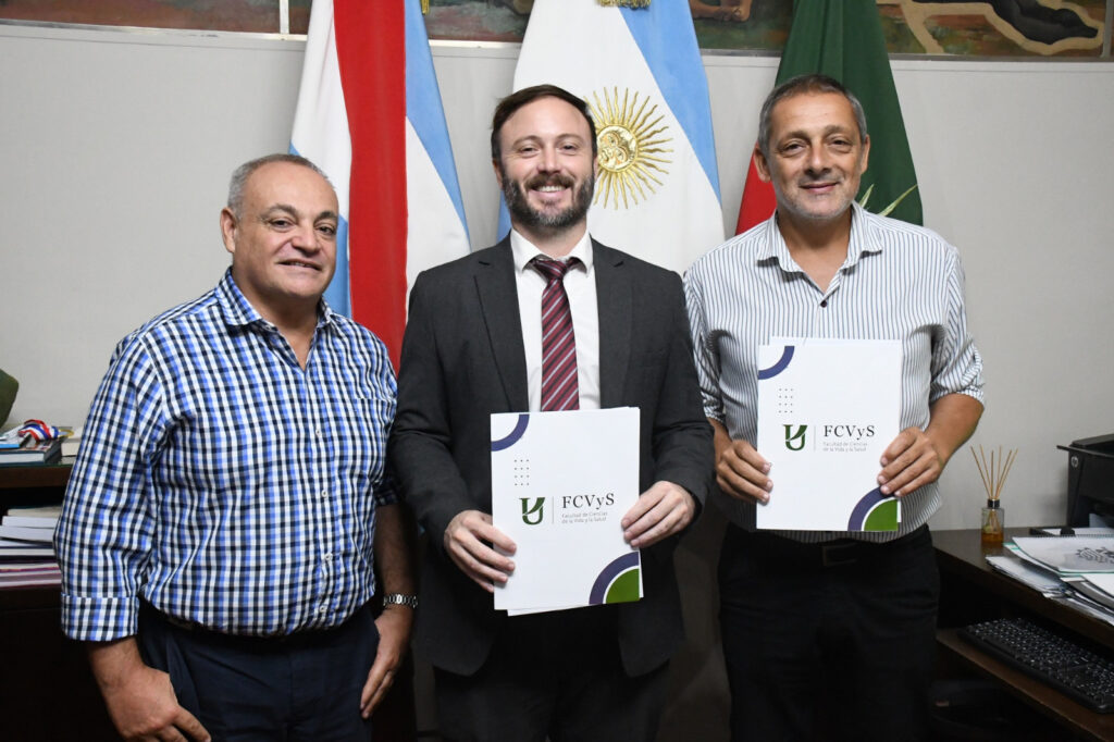 En la firma del convenio también participaron el secretario académico de la Facultad de Ciencias de la Vida y la Salud, Mg. Sergio Santamaría; el secretario general, Marcelo Navarro; y la coordinadora de la Facultad de Ciencias de la Vida y la Salud, seccional Concordia, Lic. Melina Cabrera.